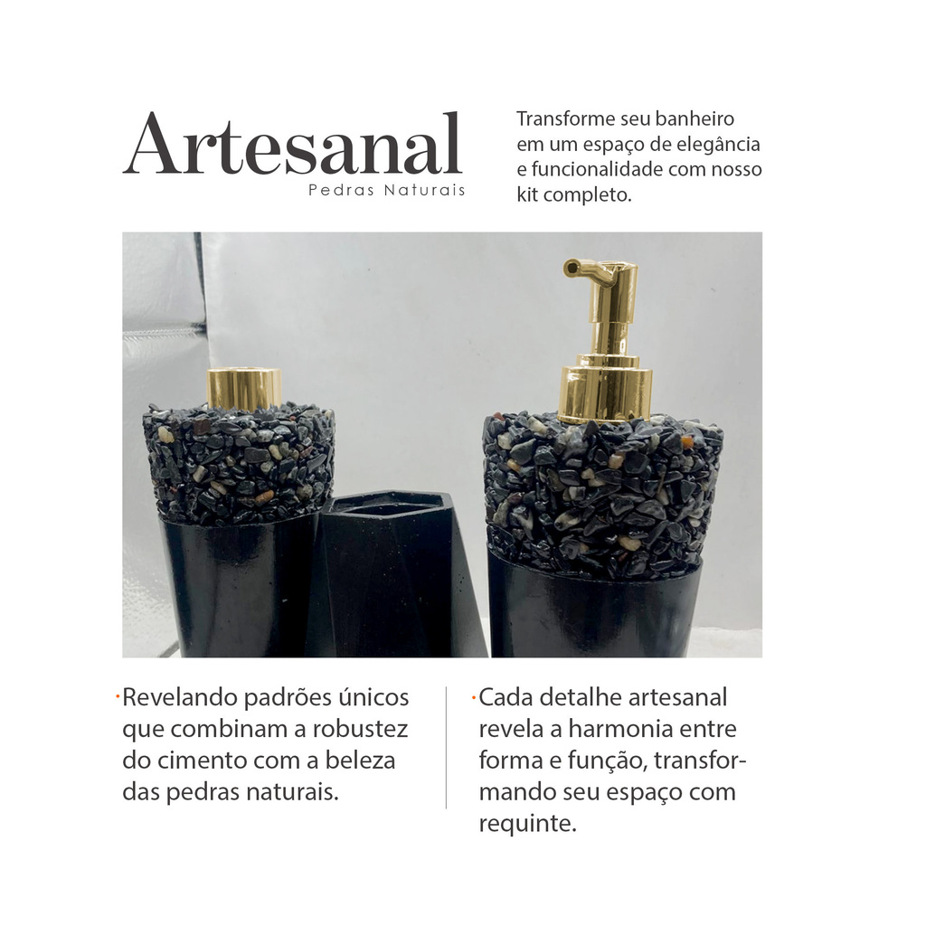 O kit é fabricado com cimento da melhor qualidade do mercado e possui tampa de plástico de alta qualidade. Na embalagem, você encontrará uma saboneteira de 220 ml, um Aromatizador um porta escovas e uma base.