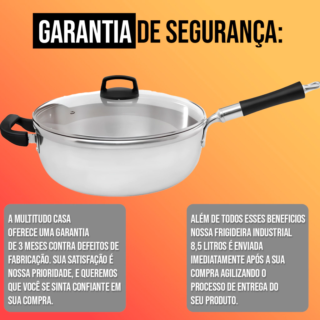 E para você ficar ainda mais tranquilo, a Frigideira Grande Com Tampa da Multitudo Casa tem uma garantia de 3 meses contra defeitos de fabricação. Isso significa que se você tiver algum problema com o produto, nós vamos trocá-lo ou devolver o seu dinheiro. Você não tem nada a perder!