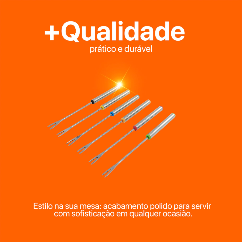 Você já se viu em um jantar especial sem os utensílios adequados para servir os aperitivos ou o fondue de forma prática e elegante Isso pode causar desconforto para os convidados e até tirar o brilho da ocasião Com este conjunto de 6 garfos de aço inox você garante praticidade e sofisticação para esses momentos especiais Perfeitos para petiscos, fondues salgados ou doces, eles são resistentes, fáceis de limpar e dão um charme a mais à sua mesa