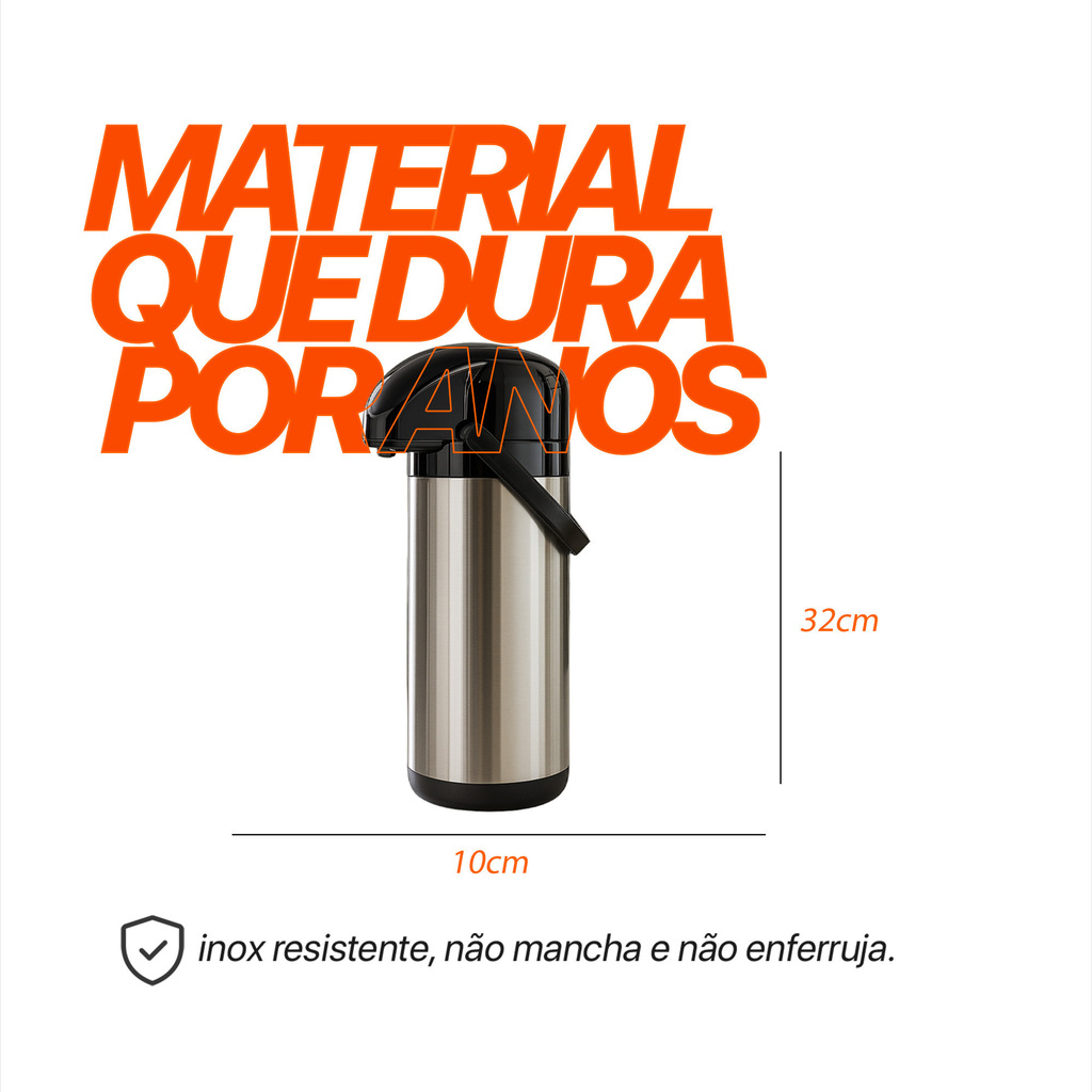 Capacidade de 1 litro Revestimento externo 100% em inox escovado Ampola interna de vidro que conserva a temperatura por longos períodos Serve líquidos quentes e frios Tampa com sistema de acionamento por pressão Alça ergonômica para facilitar o transporte Design moderno e resistente, ideal para casa, escritório ou comércio