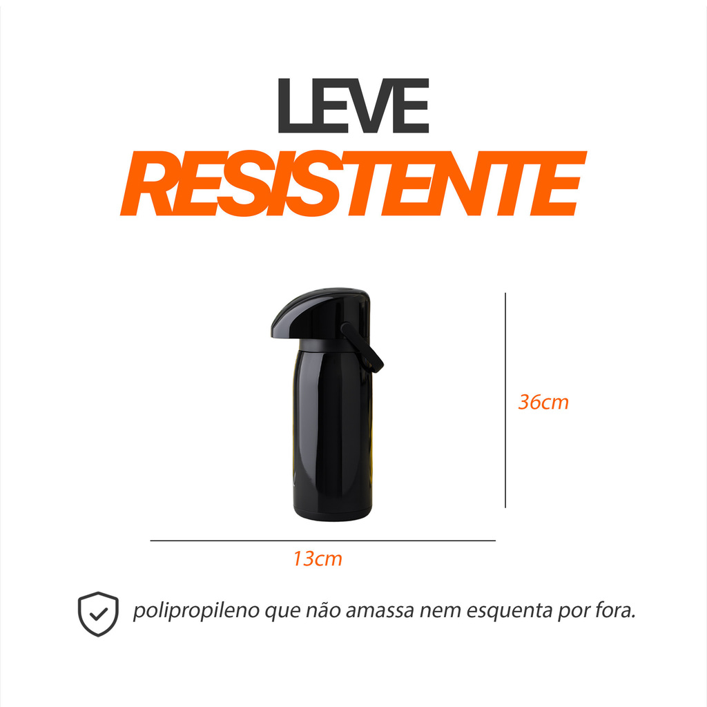 Capacidade de 1,8 litro Tampa e alça em polipropileno resistente Ampola interna de vidro, ideal para manter líquidos quentes ou frios por longos períodos Acionamento por pressão, prático e seguro Alça ergonômica para facilitar o transporte Design funcional, indicado para uso residencial, comercial ou institucional Disponível em cores elegantes para combinar com qualquer ambiente
