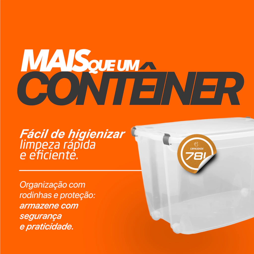O Contêiner Organizador 78 L foi feito para quem precisa ganhar espaço sem perder tempo. As rodinhas facilitam puxar e levar o box até onde você precisa; a tampa com trava mantém o conteúdo protegido da poeira. Por ser transparente, você identifica tudo de primeira perfeito para closet, quarto, lavanderia, escritório e brinquedoteca.