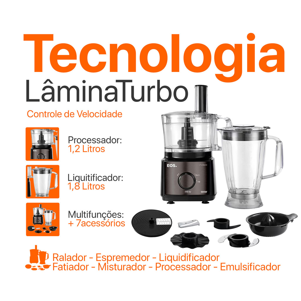 Modelo: EPS01P Marca: EOS Cor: Inox All Black Potência: 900W – alto desempenho para diversas tarefas Voltagem: 127V Capacidade: 1,2L no processador e 1,8L no liquidificador Frequência: 60Hz Medidas: 24,8 x 40,5 x 21,9 cm Peso: 2 kg