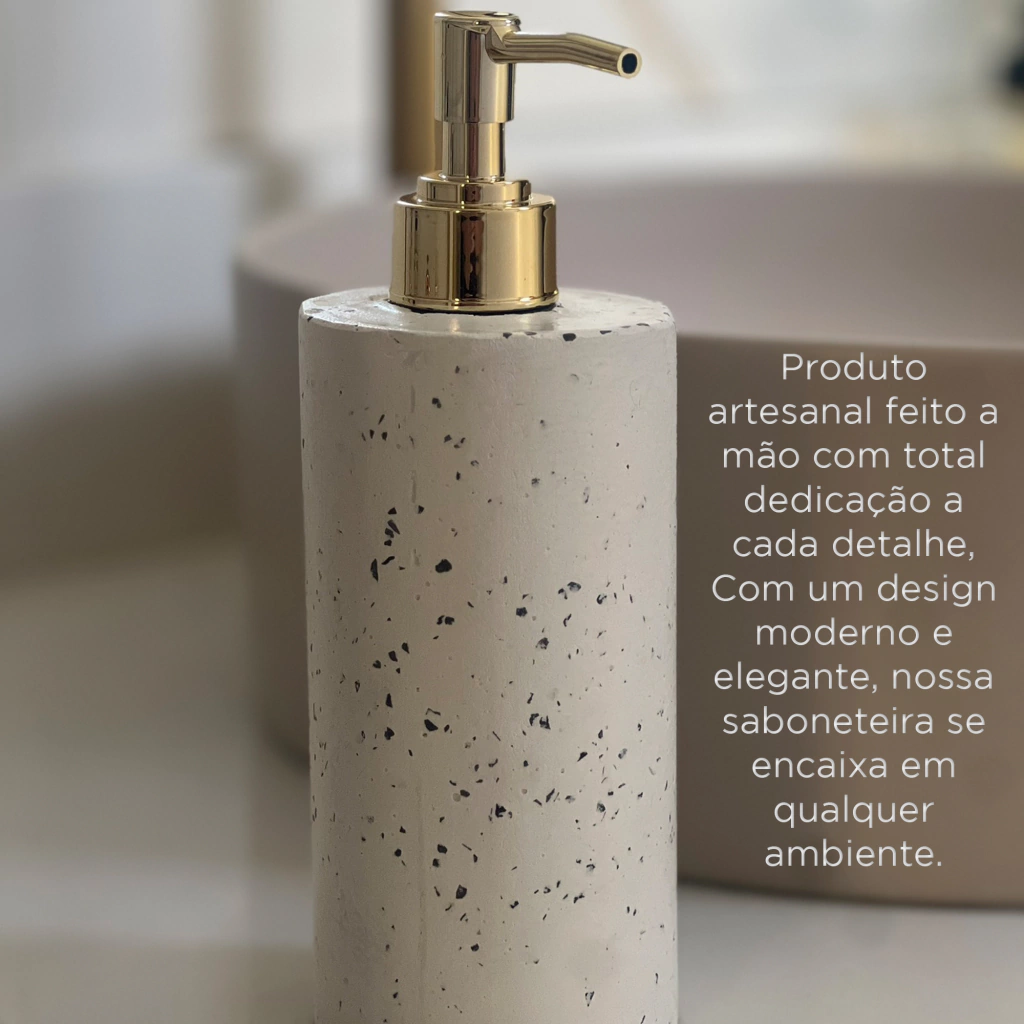 Agora, vamos falar sobre um item que vai transformar o seu lavabo ou banheiro: a Saboneteira Líquida Artesanal De Cimento Com Granilite.