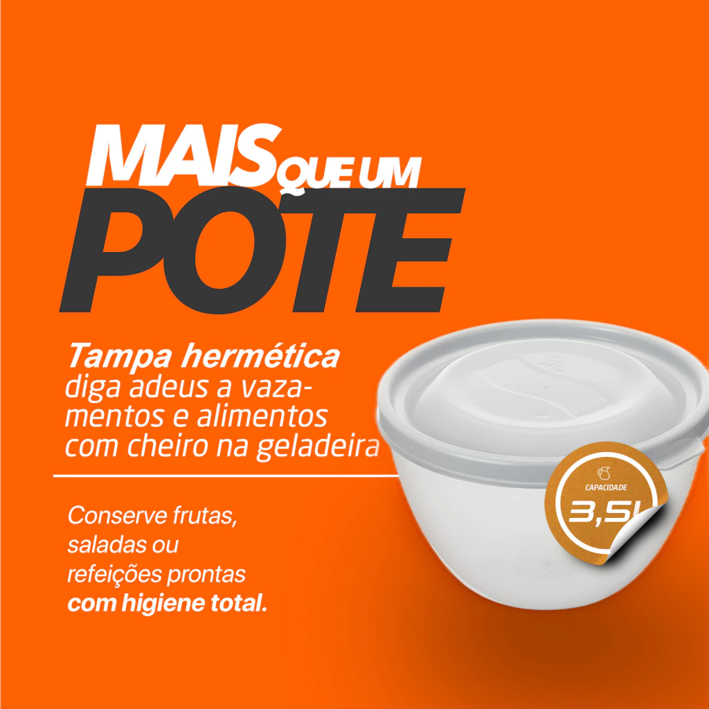 O Bowl Grande 3,5 L foi pensado para quem precisa de capacidade e praticidade. A tampa hermética proporciona uma vedação segura para armazenar saladas, massas, frutas, bolos, marinadas e muito mais, mantendo a organização da geladeira e evitando odores.