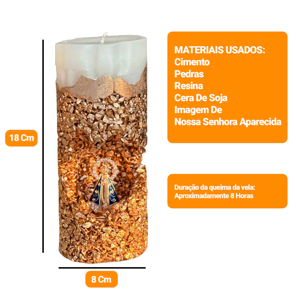 A Vela Decorativa Nossa Senhora De Parecida tem aproximadamente 18cm de altura, 8cm de diâmetro e pesa cerca de 1kg. Ela é feita com materiais de alta qualidade, como cimento, cera de soja, pedras naturais e uma imagem de Nossa Senhora de Aparecida.